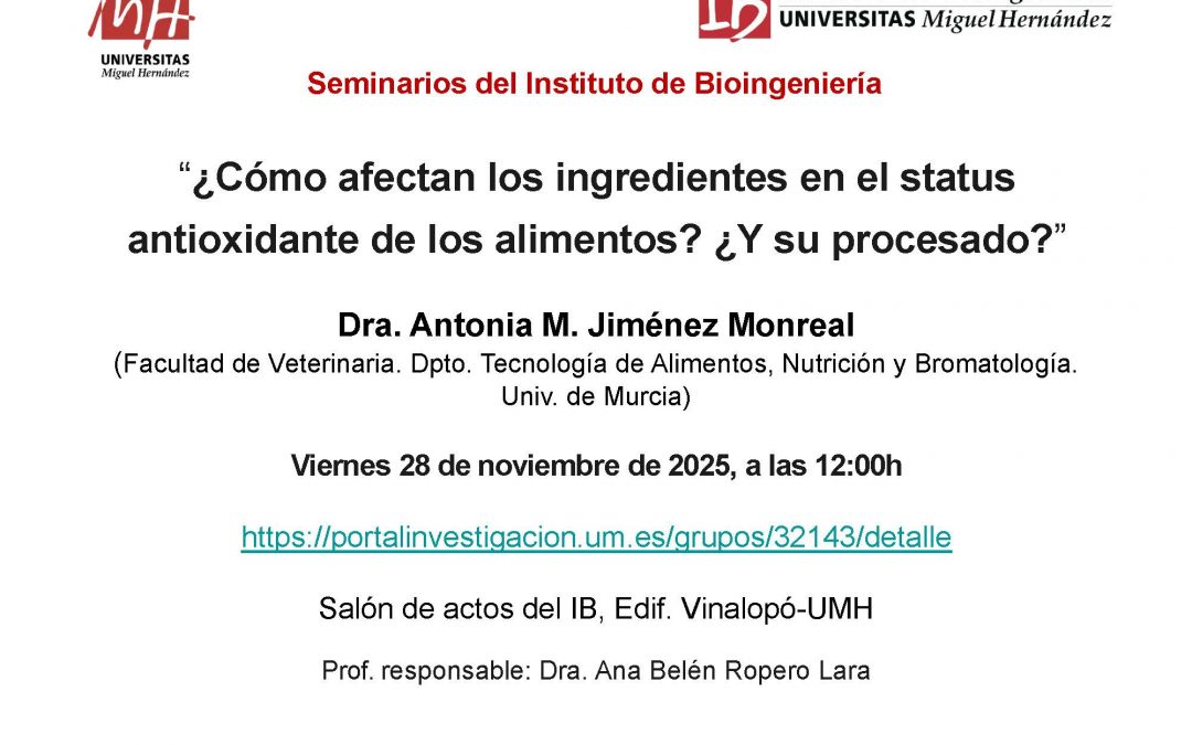 El próximo viernes, 28 de noviembre, a partir de las 12:00 en el salón de actos del Instituto de Bioingeniería, tendrá lugar el seminario: «¿Cómo afectan los ingredientes en el status antioxidante de los alimentos? ¿Y su procesado?«.